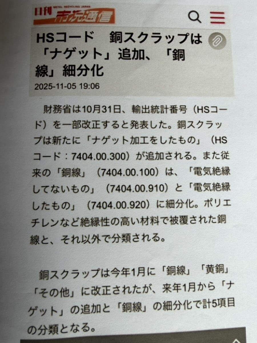 財務省は10月31日、輸出統計番号(HSコード)を一部改正すると発表した。銅スクラップは