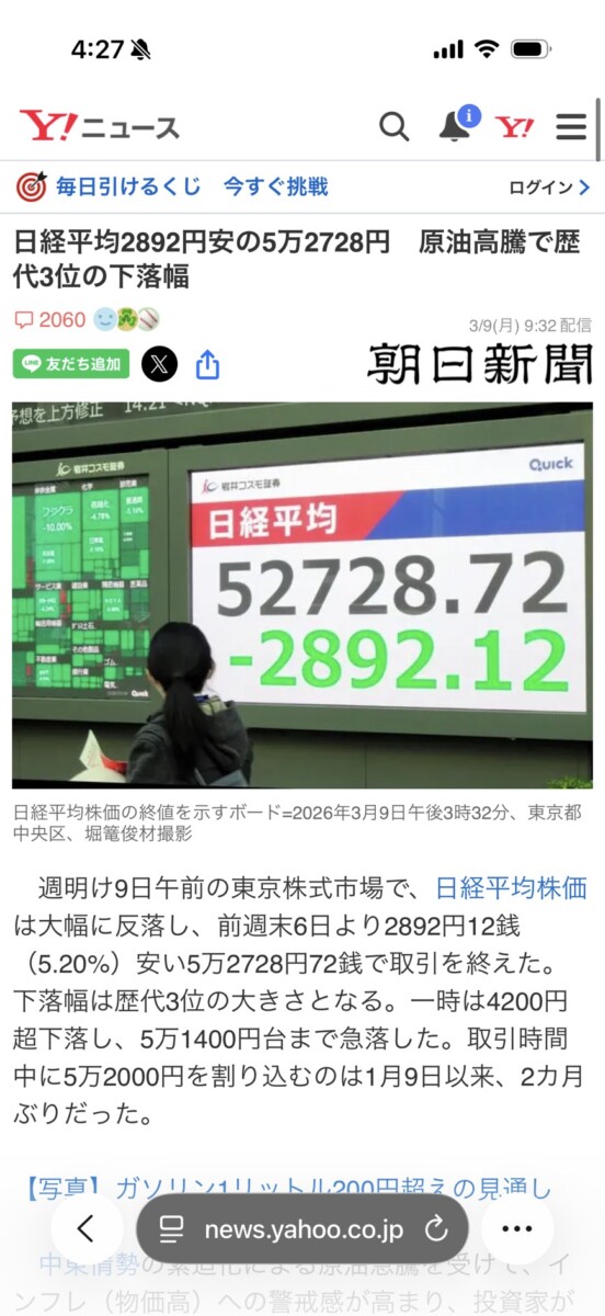 日経平均2,892円安の5万2728円 原油高騰で歴代3位の下落幅